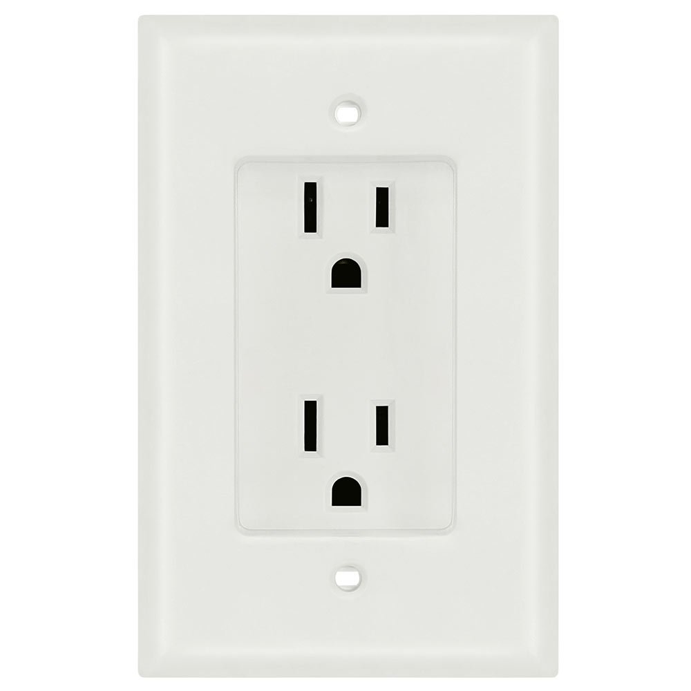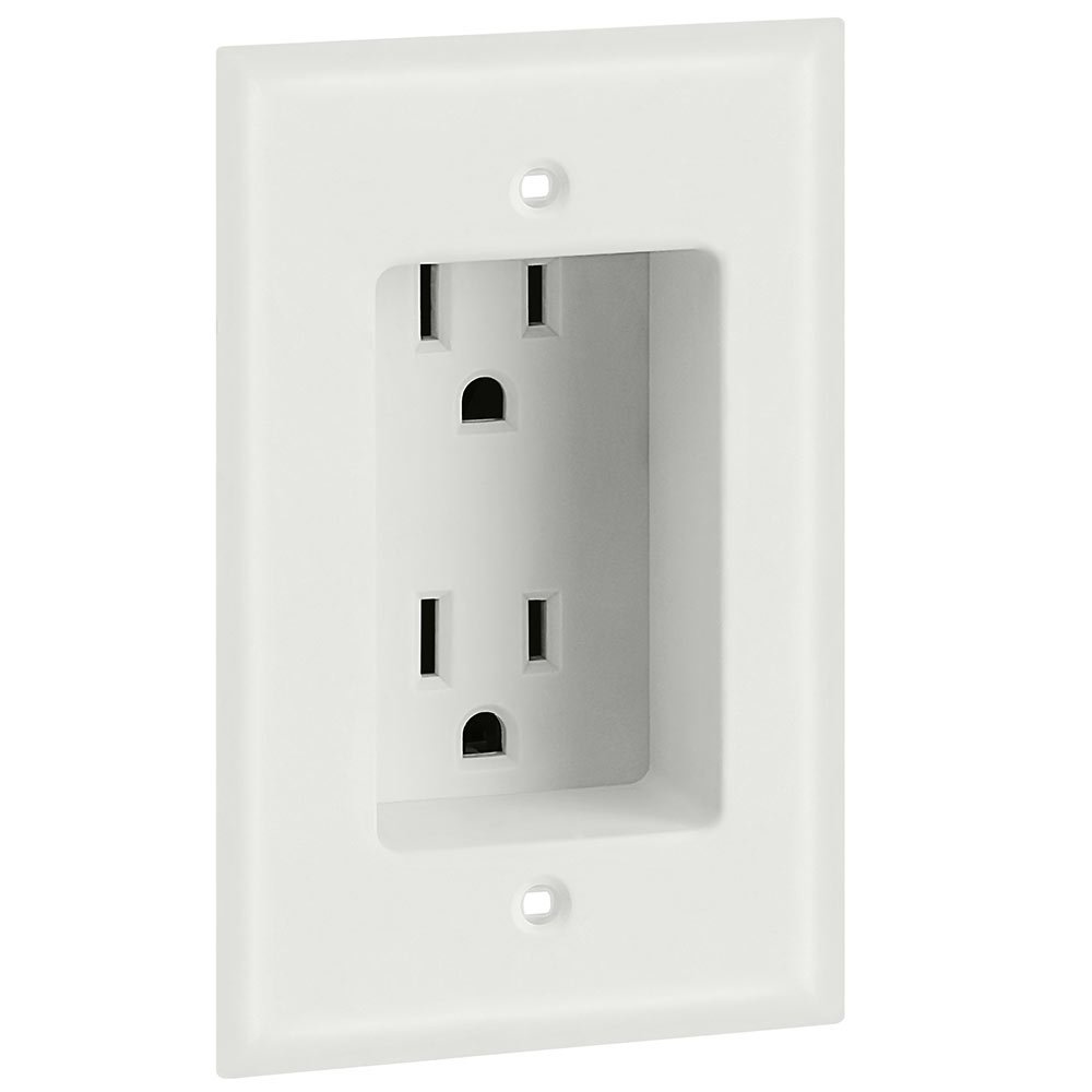 Wall Plate- 1 Gang Recessed Dual Power Outlet, UL Listed This product has a minimalist design that is sleek and unnoticeable. Perfect for remodeling or new construction projects, this power outlet creates 1 inch of extra room to connect to your devices. It comes with a built-in wall plate and works great behind flat screen displays. Features: 125V 15Amp Self-grounding UL-Listed Color: White Dimensions: 4.5/8in x 2.7/8in x 2in, 1in recessed area